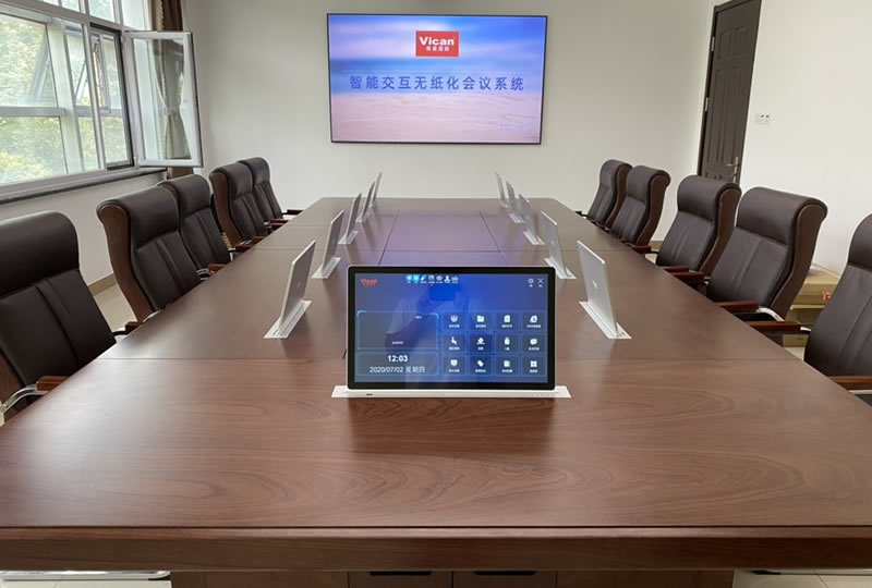 其特征是:文件傳輸網(wǎng)絡(luò)化,文件顯示電子化,文件編輯智能化,文件輸入輸出可控化。無紙化會(huì)議系統(tǒng)的一個(gè)基本特征是:會(huì)議室設(shè)有公共視頻顯示的大屏幕和每個(gè)席位單獨(dú)控制和使用的席位顯示器,選擇席位顯示或稱異步顯示時(shí),由與會(huì)者自行操作該無紙化會(huì)議終端,同時(shí)無紙化會(huì)議終端如同一臺(tái)獨(dú)立使用的標(biāo)準(zhǔn)計(jì)算機(jī),每個(gè)參會(huì)者可以自主地在顯示公共信號(hào)的同步顯示或異步顯示之間一鍵切換。