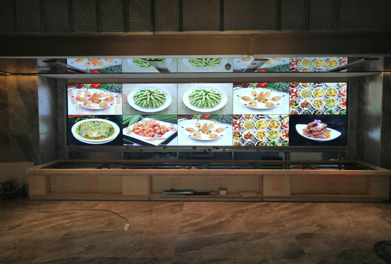 惠州海鮮酒店采用這套顯示大屏,采用2x5拼接、55寸液晶拼接屏,3.5mm拼縫,主要用來(lái)顯示美食特色與信息公告。