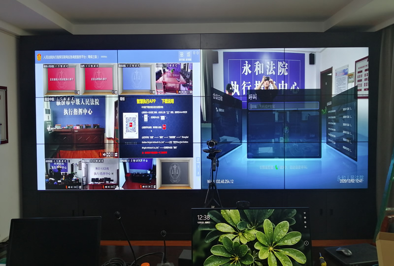 本案例中,維康國際為永和人們法院提高一套視頻會(huì)議顯示屏,主要由3行4列、55寸3.5mm液晶拼接屏組成,主要用來視頻會(huì)議顯示使用,大屏畫面高清顯示,產(chǎn)品性能穩(wěn)定。