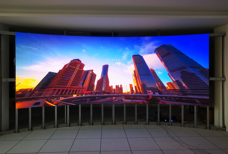 本案例中,維康國際為廣州天河某軟件公司提供一套展廳LED顯示屏,采用弧形安裝方式,COB小間距技術(shù),有著更好的顯示效果,如上圖所示。