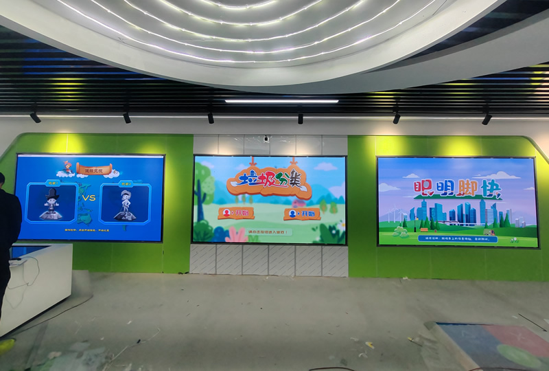 本案例中,維康國(guó)際為泰安市垃圾分類(lèi)科普教育中心提供一套展廳LED屏,由三組P1.53小間距LED組成,大屏幕顯示清晰,色彩柔和,畫(huà)面質(zhì)感好。