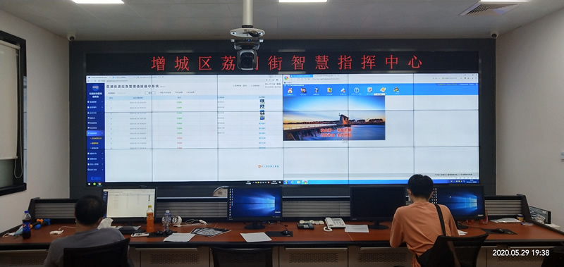 廣州市增城區(qū)某街道智慧指揮中心,采用維康國際提供的一套3x6拼接、55寸液晶拼接屏,雙邊拼縫距離為3.5mm,主要用來視頻監(jiān)控顯示與指揮。