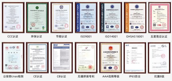 3、30多項(xiàng)國內(nèi)外資質(zhì)認(rèn)證,包括ISO9001、ISO14001、OHSAS18001、強(qiáng)制3C、節(jié)能認(rèn)證、環(huán)保認(rèn)證、公安部檢測報(bào)告、CE、CB、FCC、ROHS及各項(xiàng)專利、軟件著作權(quán)等。