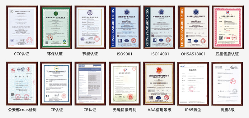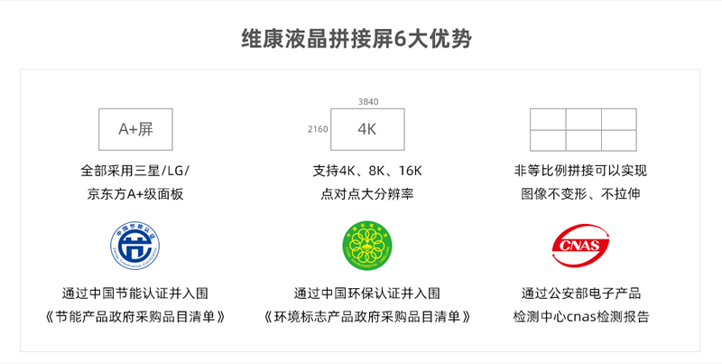 維康國際通過了ISO9001質(zhì)量管理體系、ISO14001、OHSAS18001、3C、節(jié)能認證、環(huán)保認證、公安部cnas檢測報告、抗震8級、防塵、CE、CB、FCC、ROHS、外觀專利、大屏軟件專利等,在支持客戶參與招投標項目中有很大優(yōu)勢。