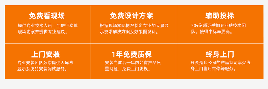 圓弧形LED顯示屏的安裝特別考驗技術人員的實力,我公司針對這一點提供全國上門安裝與調(diào)試,并且后期有售后問題還提供終身上門更換及檢修服務,保證用戶長久使用。